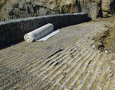 - Консервация грунта и защита от эрозии. Прочные сетки с камнями препятствуют вымыванию грунта поверхностными водами, поскольку квалифицированный монтаж габионов на геосинтетике служит, как отличный фильтрующий барьер.