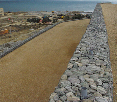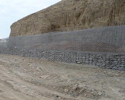 пустые проволочные габионы работники вручную насыпают камень для подпорных стен, равномерно распределяя вес в конструкции. Будучи связанными прочной проволокой между собой, габионы формируют прочную конструкцию.